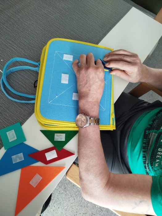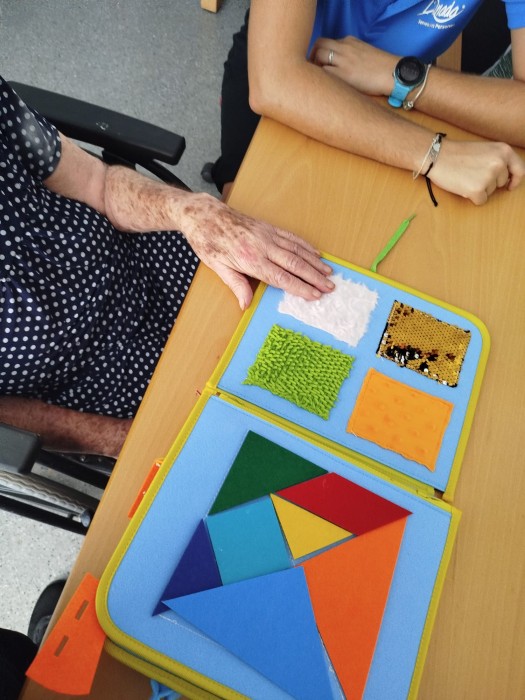 (Os dejamos por aquí un ejemplo con fotos de nuestros/as residentes realizando una actividad sensorial, en este caso a través del tacto)