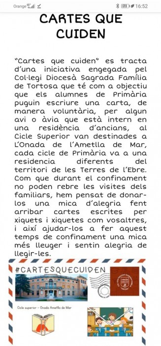 Hem començat un Projecte I tergeneracional amb els nens i nenes del Col•legi Diocesà Sagrada Familia de Tortosa. Aquests nens i nenes ens han enviat cartes desde casa seva confinats per a explicar-nos el seu dia a dia transmetent alegria i fent mes lleuger el confinament... i nosaltres els hi contestarem.