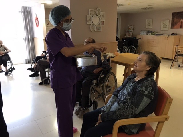 Com podeu veure a les fotos mantenim la distància de seguretat entre residents, els materials utilitzats els toca la professional i després es desinfecten.