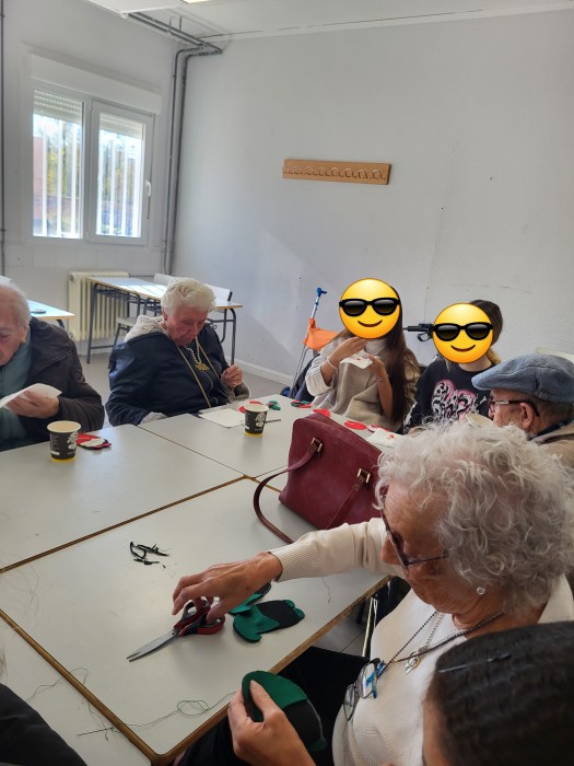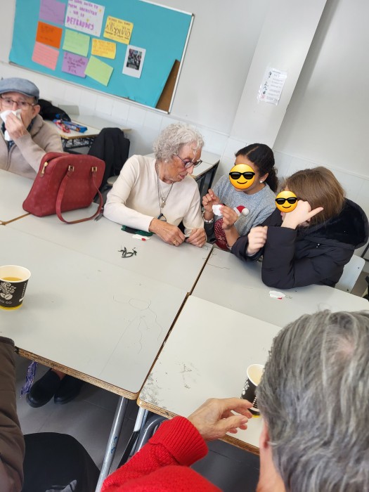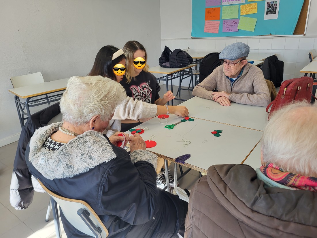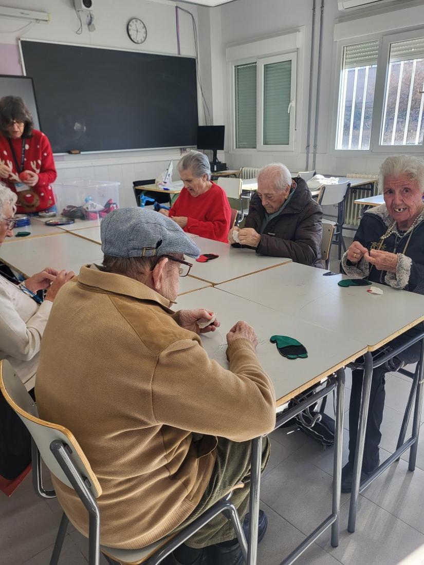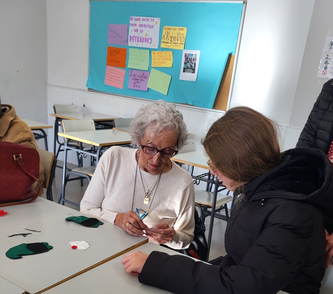 Nuestros mayores le enseñan a los niños del Instituto de Ana María Matute técnicas de costura.