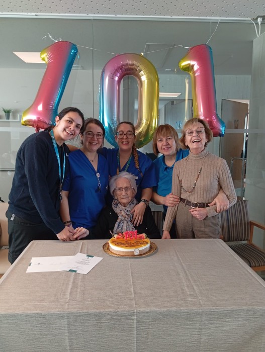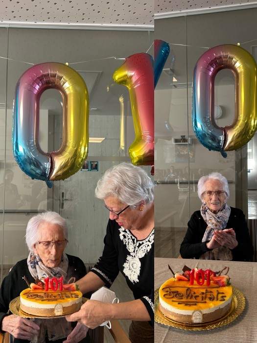 Avui estem de celebració! Leonor celebra els 101 anys en nosaltres, la seva família i també en Marcela, la regidora de Serveis Socials que ens ha visitat per fer-li entrega d'una felicitació i un pastís ben bo!