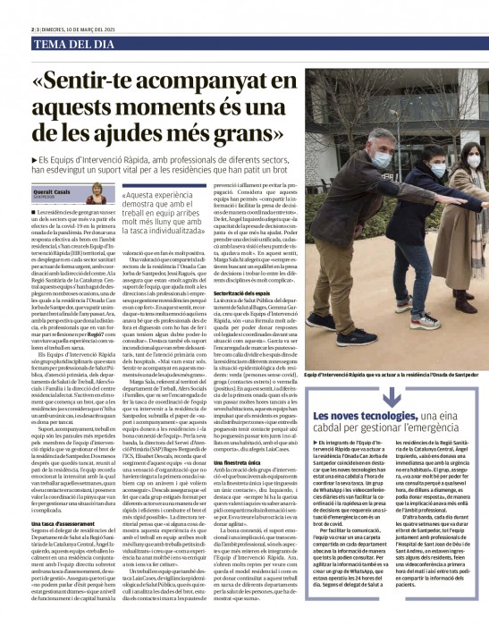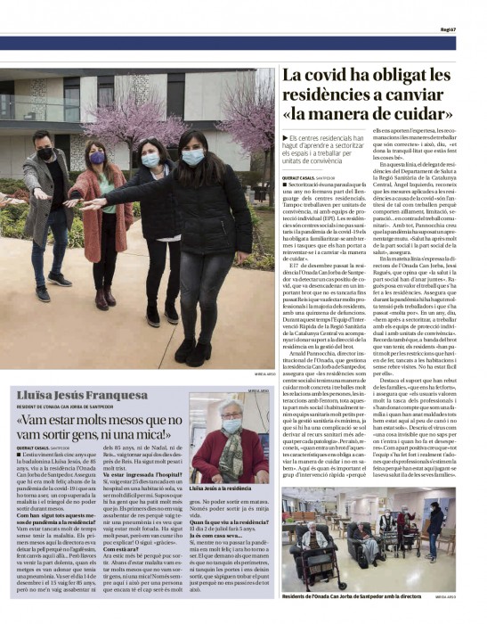 El diari Regió7 dedica un especial als Equip d’Intervenció Ràpida (EIR) territorial que s'han desplegat pel territori per actuar de manera urgent, en coordinació amb els centres residencials, quan s'ha detectat un brot de Covid-19. En l’especial hi intervenen Arnad Pannocchia, Director d’Operacions de L’Onada Serveis, Jessi Ragués, Directora de L’Onada Santpedor i Lluïsa Jesús Franquesa, usuària de la residència santpedorenca, que va estar 25 dies ingressada a l'hospital.