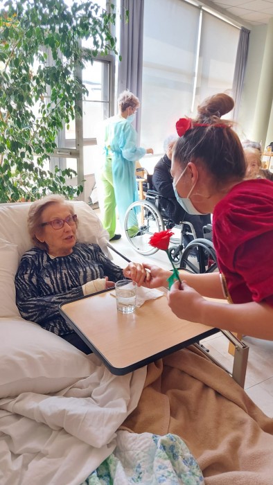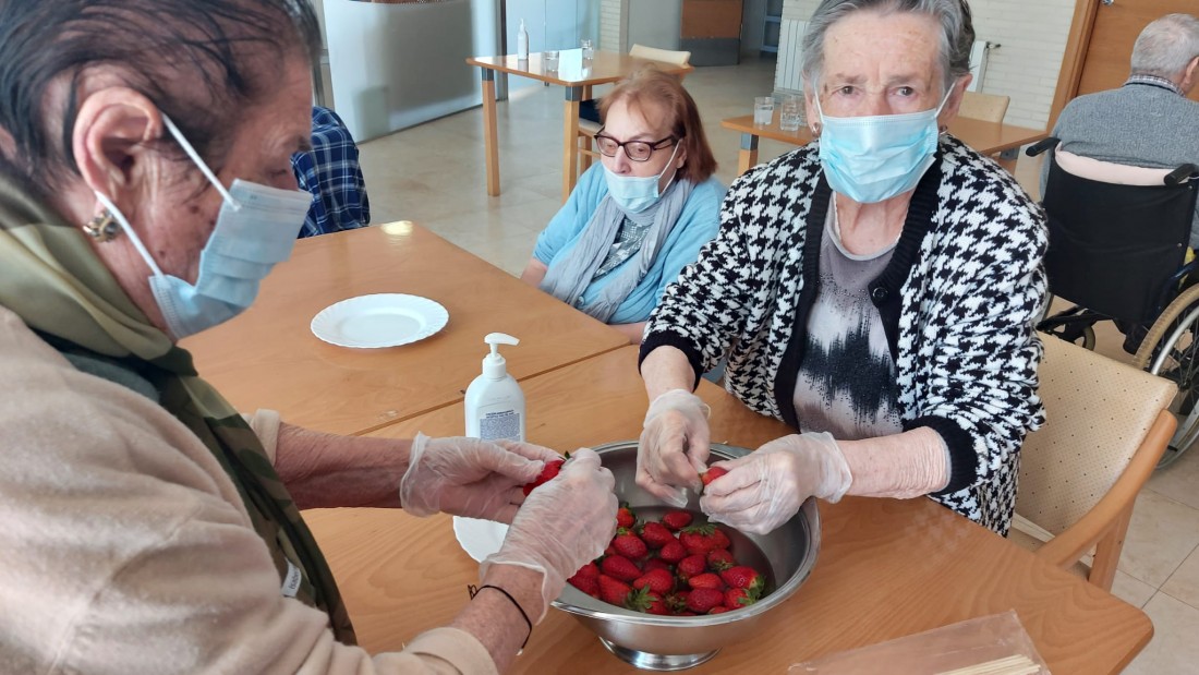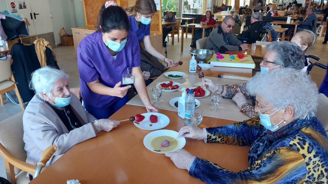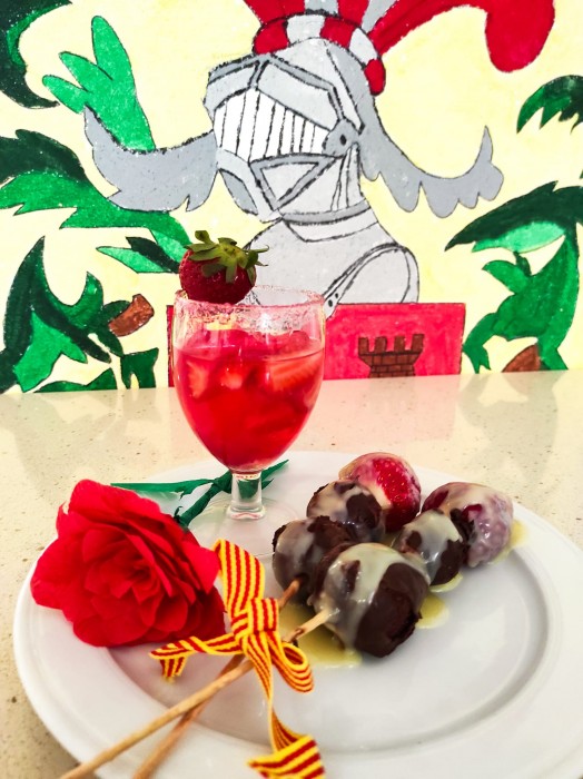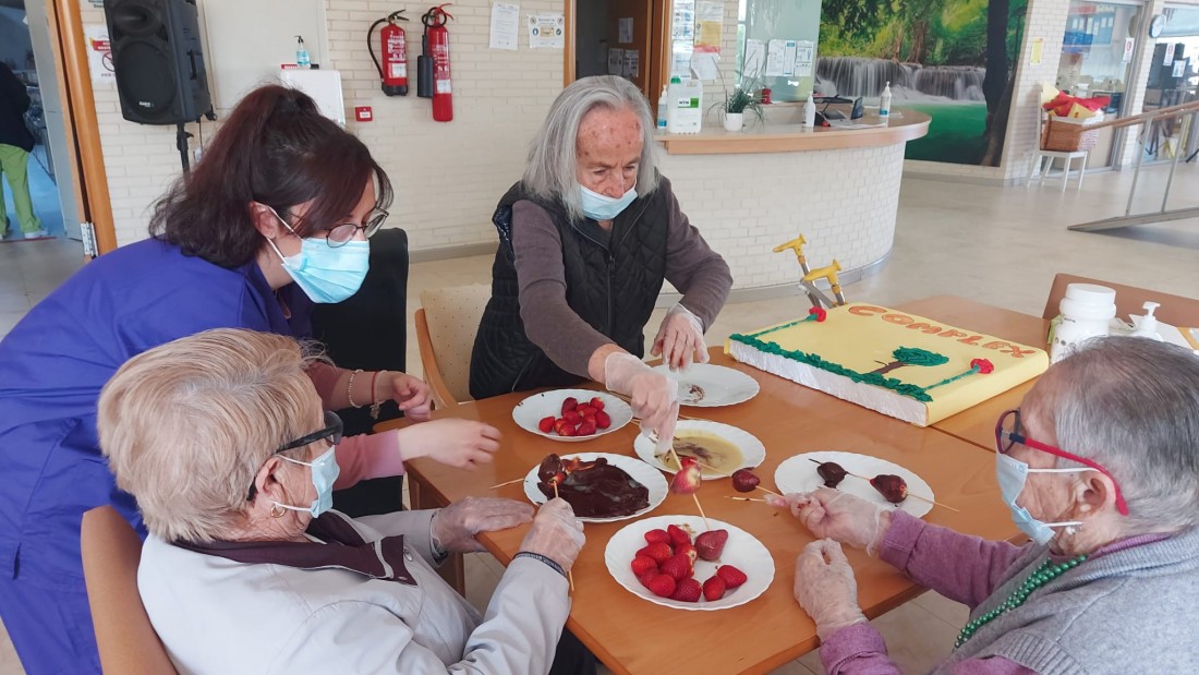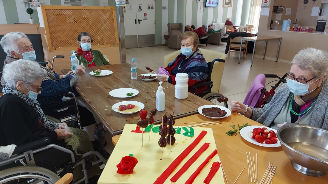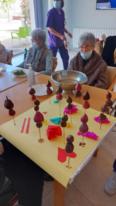 Aquest Sant Jordi ha estat molt especial, hem començat de bon de matí preparant brotxetes de maduixa amb xocolata negra. Hem volgut substituir el color vermellós de les roses pel de les maduixes. La xocolata negra ha ensucrat la brotxeta igual com la festa de Sant Jordi, que ha ensucrat la vida dels iaios i iaies de la nostra Residencia.