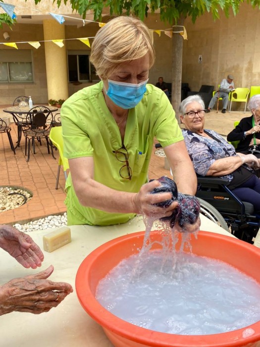 Aquesta tarde hem sortit al jardí i hem rentat roba com es feia abans. Amb una pastilla de sabó i un safareig d'aigua, moltes d'elles ens han explicat com es feia, i s'ho han passat moltbé. Mentres, alguna d'elles també ens explicava com anaven a buscar l'aigua i la treien del pou amb un motor de manivel•la i anaven als safarejos... Ha sigut una tarde molt entretinguda i plena de molts records!!