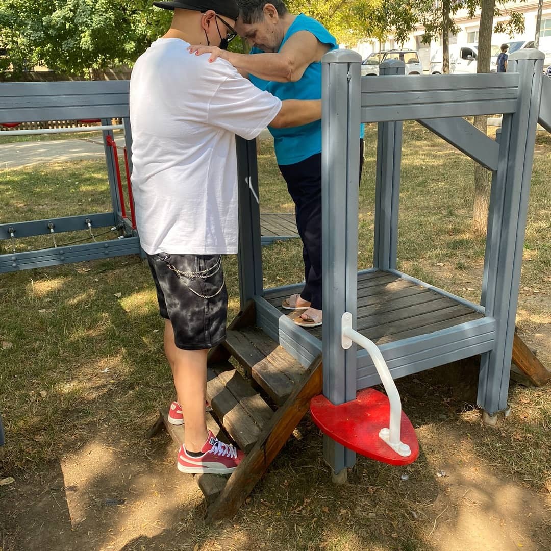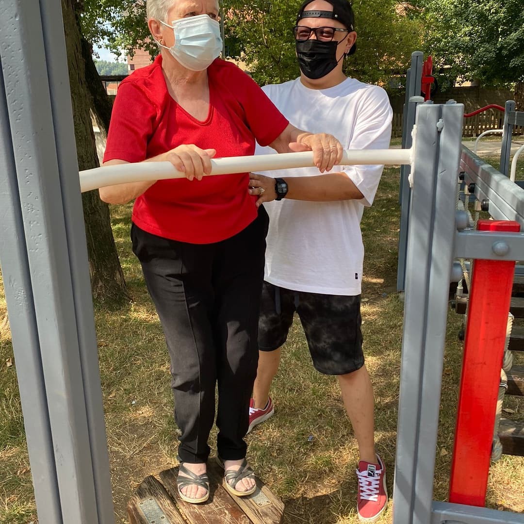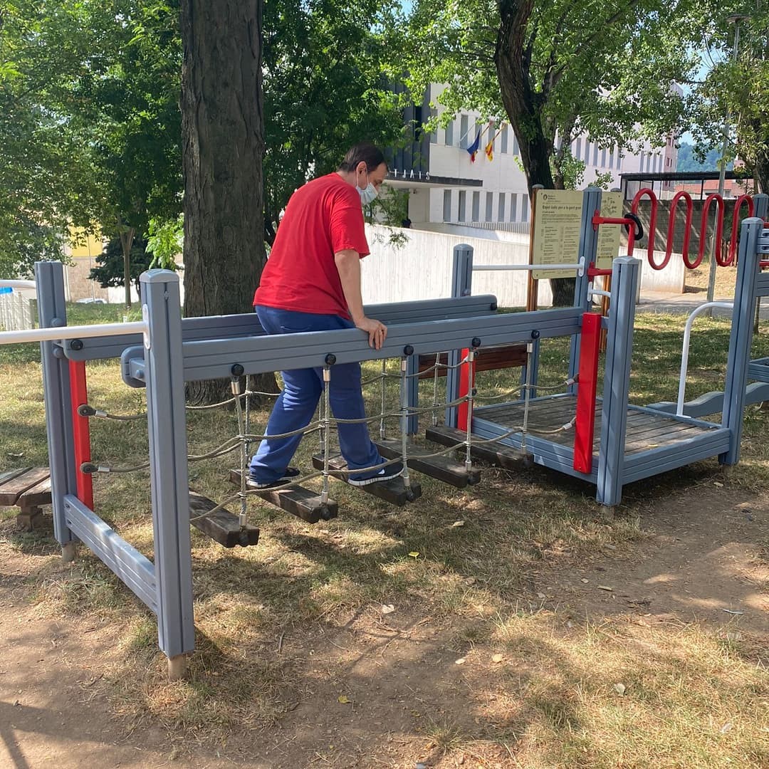 A Berga hi tenim un espai, molt a prop del centre, on la gent gran s'hi pot anar a exercitar. Avui hem aprofitat l'hora quan no hi tocava el sol i feia molt bon temps per anar-hi. Asseguts a l'ombra mentre altres provaven en circuit.
