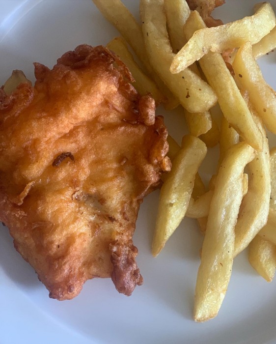 Chicken pie, fish and chips and pudding !