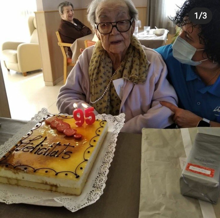 Avui la Secundina fa 95 anys i la seva filla li ha portat un pastís per celebrar-ho.
