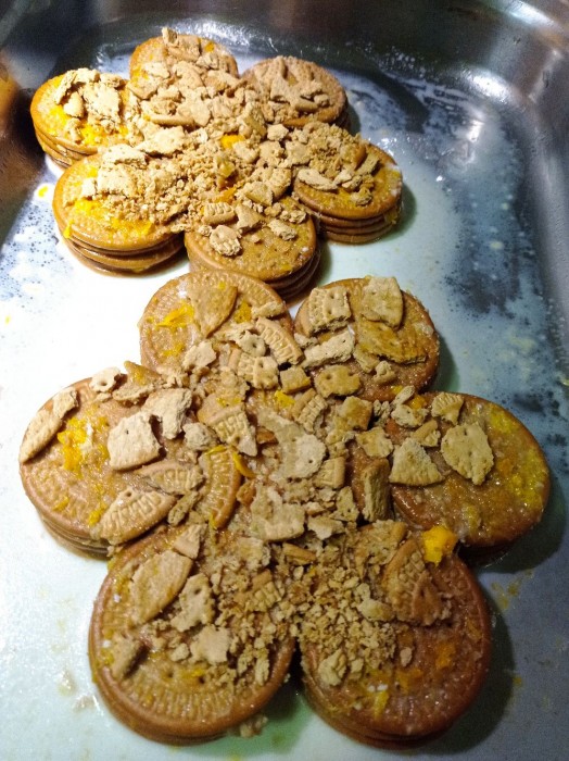 Pastís que vam realitzar per a l'aniversari de la nostra Roya. És de galeta maria i crema. Amb forma de flor.
