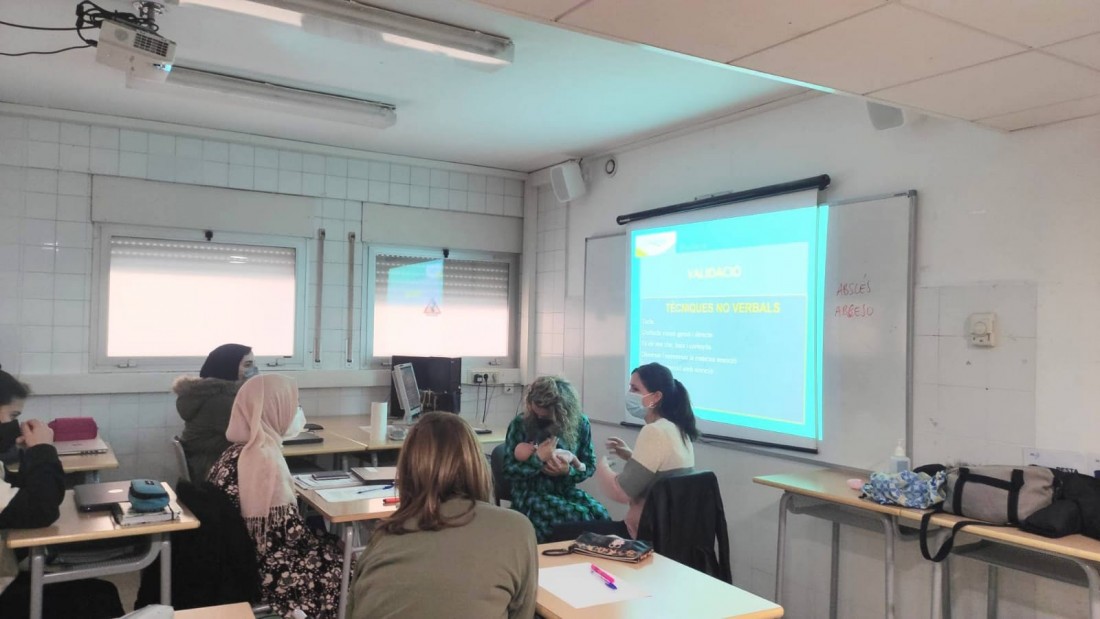 Aquest matí, la Fisioterapeuta i experta en DCM, Maria Reig; i la Psicòloga i Experta en Validació, Núria March, han anat a l'Institut Baix Camp de Reus a fer una xerrada amb l'alumnat de Cures Auxiliars d'Infermeria.