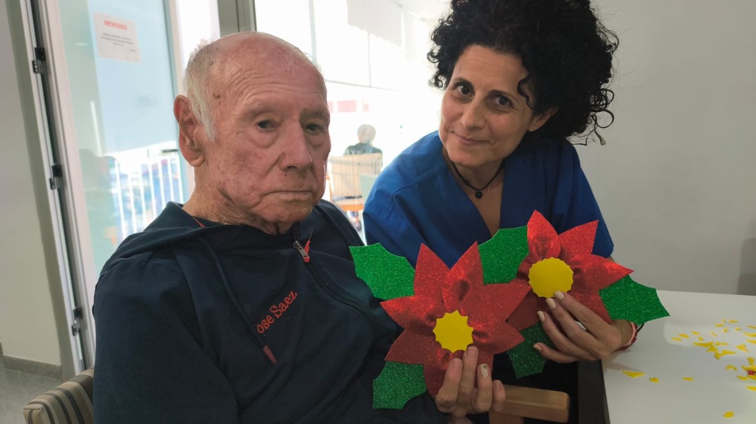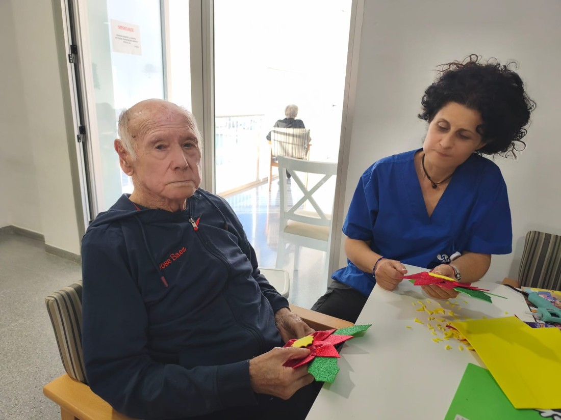En nuestra residencia fomentamos momentos llenos de creatividad y compañerismo. En la imagen, una cuidadora acompaña a uno de nuestros residentes mientras juntos elaboran flores de Pascua para la decoración navideña.