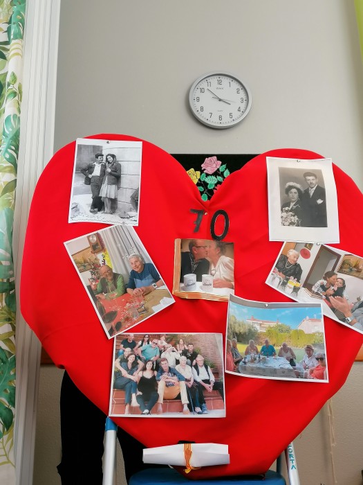 Al centre els hem fet un homenatge, no tothom arriba a complir aquesta fita i amb la salut de ferro que tenen els dos. Ells ens han anat explicant la seva història d'amor, i Emma, la seva RA, l'ha recollit i l'ha escrit per tal de trasmitir-la a tots els companys del centre. La família ha col·laborat aportant fotografies de la seva història per tal de fer-los-hi una sorpresa.