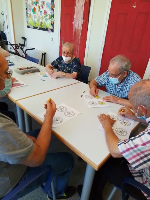 Los usuarios muy entretenidos pintando los dibujos para los posavasos.
