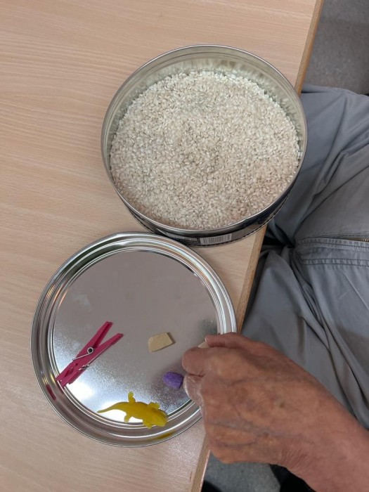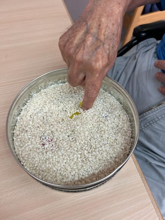 Realitzem un taller d'estimulació sensorial, on es realitza amb diferents textures. On ajuda a la persona a sentir i discriminar.