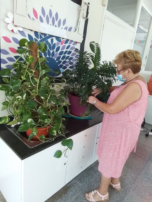 Elena cuidando y regando las plantas del interior del centro.
