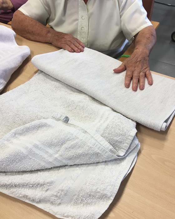 Realitzem taller de tasques vocacionals! Amb l’ajuda dels avis i àvies tenim tota la roba i tovalloles ben plegades! Amb les activitats de la vida diària potenciem la mobilitat i psicomotricitat!