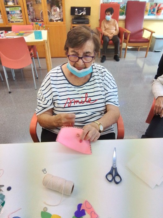 Avui a primera hora del matí, hem continuat cosint les bossetes de feltre. És un moment que els hi agrada perquè a més de treballar fan tertulia entre elles.