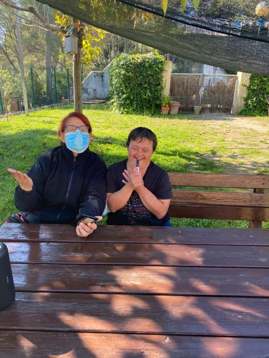 Avui, hem improvitzat un karaoke en el pati de la torre de la residència, una zona amb gespa, taules de pícnic, solet i sombra. Un espai perfecte per poder estar relaxats i relaxades i cantant les seves cançons preferides.