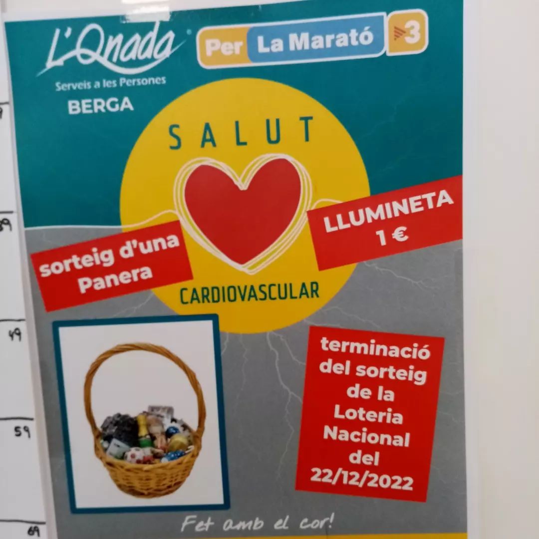 Encetem llumineta solidària per la Marató. Trieu el vostre número i si coincideix amb la terminació del 1r premi del sorteig de Nadal, guanyareu una panera! Tot els beneficis aniran destinats a la Marató, aquest dedicada a la Salut Cardiovascular.