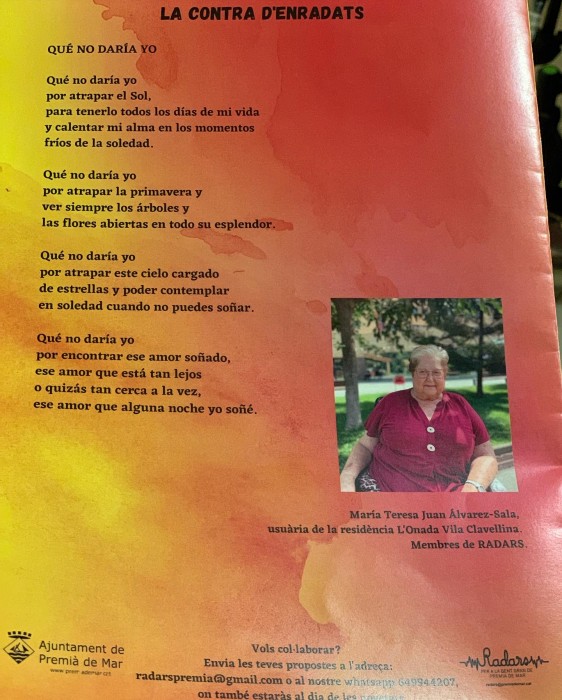 La nostra estimada Teresa, va escriure una poesia molt maca que avui ha sortit publicada a la revista radars de Premià de Mar.