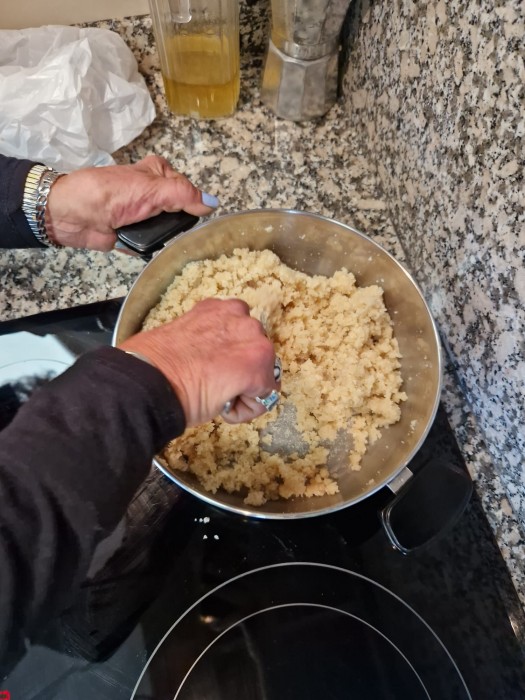 Recordem quan veiem a la família fent els torrons. Primer vam ficar tots els ingredients a l'olla, o fam anar remenant i després ho vam aplanar.