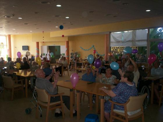 El divendres vam cel.lebrar els aniversaris dels residents que havien fet anys al mes d'Agost, a banda de la tradicional corona i fotografia, aquesta vegada vam incorporar els jocs amb globus, mentre algunes companyes tallaven els deliciosos pastissos que ens van fer les cuineres.. unes altres vam fer petar els globus amb el pompis, a alguns els feia una mica de por, els altres cridaven abans que esplotes el globus, algun atac de riure.. però ens ho vam passar molt bé, mireu les cares d'alguns resident!!! Moltes felicitats a tots!