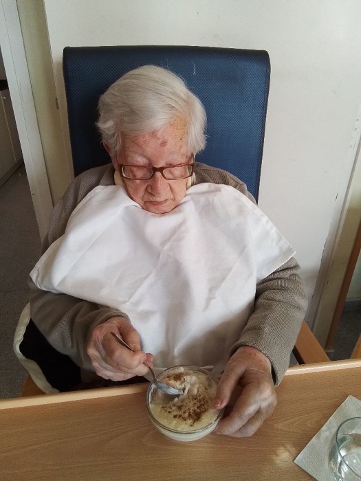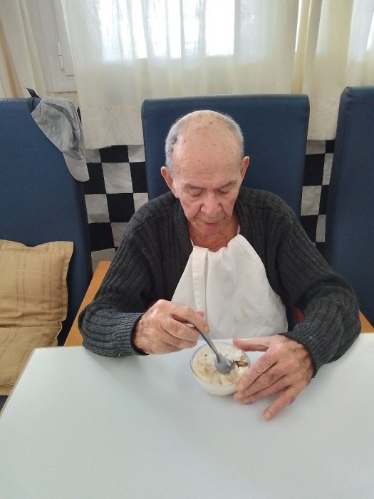 Disfrutando de un rico postre.