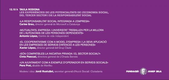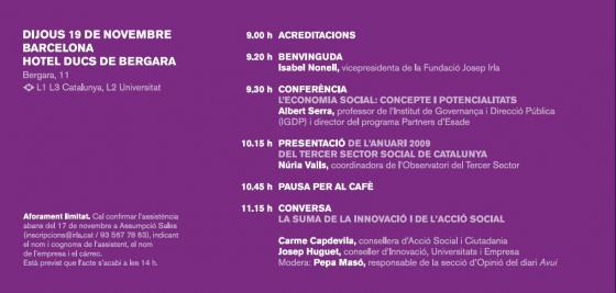 El proper dijous 19 de novembre es portaran a terme les Jornades d'Economia 2.009 de la Fundació Josep Irla, que sota el títol "Les potencialitats econòmiques de la innovació en l’àmbit social" tractaran aspectes estratègics del sector dels serveis socials. L’acte tindrà lloc a l’hotel Ducs de Bergara de Barcelona i durarà tot el matí.