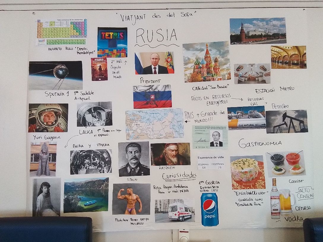 Actividades fuera y dentro del centro. José María regando las plantas y Pepi recortando y pegando fotos para el mural Viajando desde el Sofá.