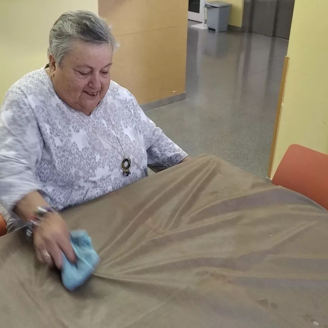 En nuestro centro de día es muy importante mantener la autonomía y la movilidad. Diariamente se potencia la participación en las tareas relacionadas con el comedor: poner las mesas, recoger los manteles y barrer.