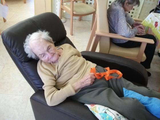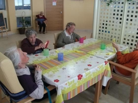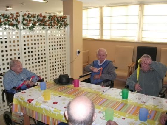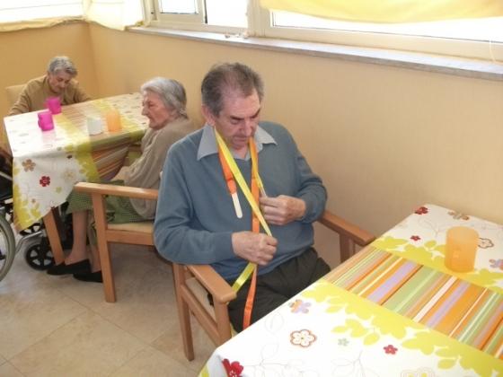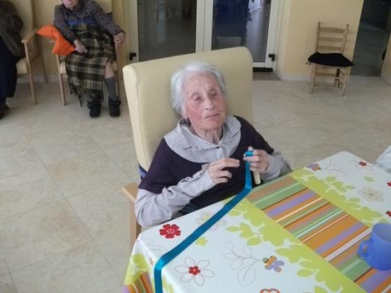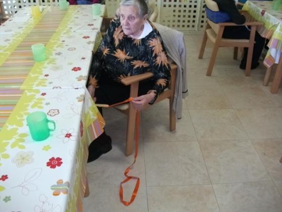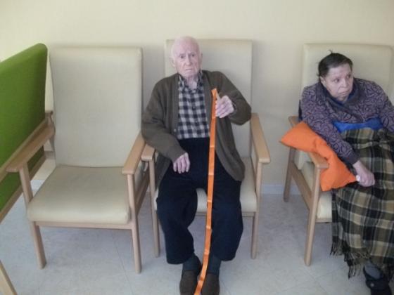 No se que passa quan es sent música a l'Onada de la Ràpita, que els peus de molts dels nostres residents pareix que vagin sols. Ara els més assistits a part del treball que es fa amb ells mitjançant la música també ho combinem amb la mobilitat. Ens vam ajudar d'unes cintes de colors que havien de moure al ritme de la música, va ser molt divertit. Algún se'l va possar al coll i li va recordar quan es possava corbata, perque´intentava fer-se el nus!!!