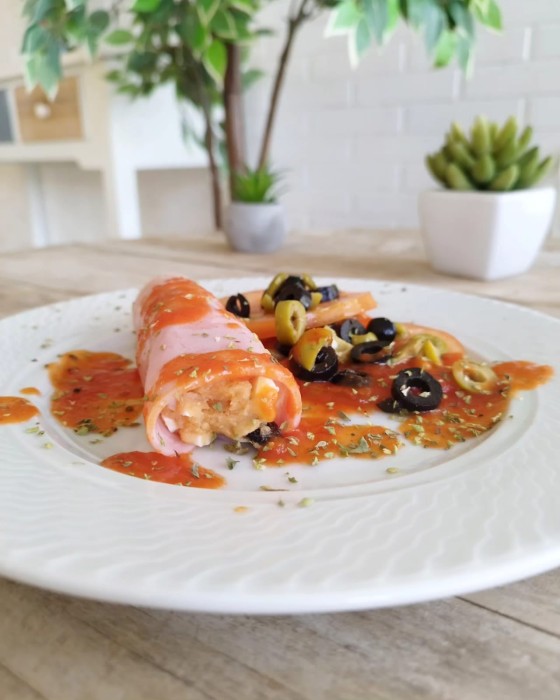 CANALÓ D'ESTIU: Pernil dolç farcit de patata, tonyina i ou acompanyat de tomàquet i olives amb encenalls d'orenga.
