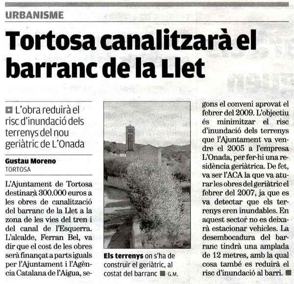 Tortosa canalitzarà el barranc de la Llet.