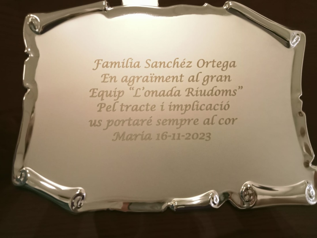Avui volem expressar el nostre agraïment i afecte a la família de la Sra. Maria Sánchez, que ahir van venir a acomiadar-se de tot l'equip, i ens van fer aquest detall tan especial com a mostra d'agraïment pel tracte rebut i per la implicació per part del personal de L'Onada Riudoms durant tots aquests anys que la Maria ens ha acompanyat.