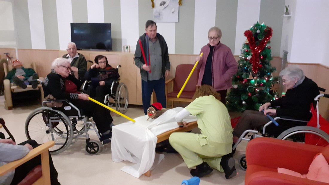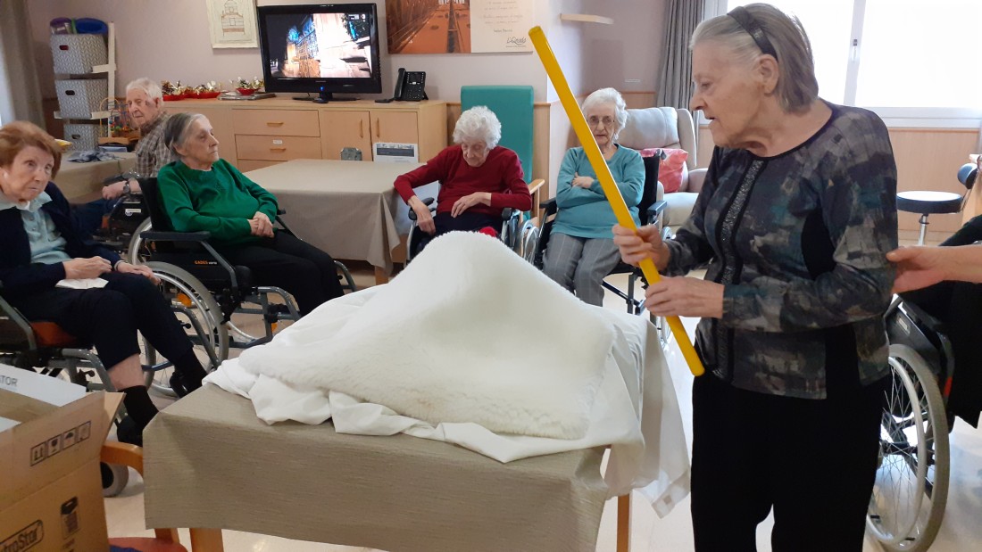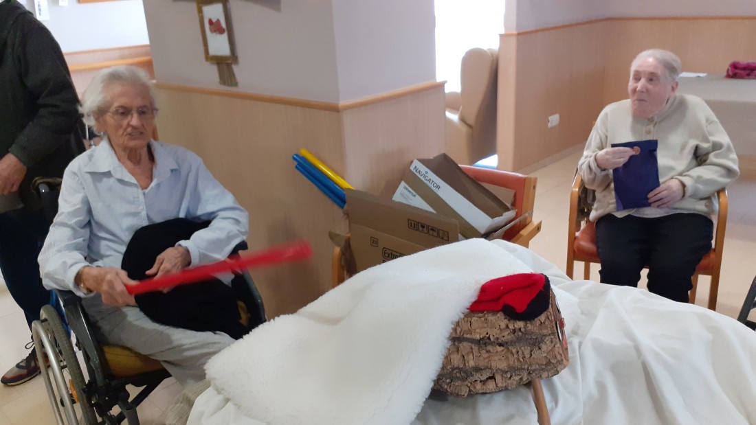 Gracias a que le han pegado fuerte con el palo han salido del tronco unos regalos muy prácticos para los residentes, pañuelos, gorros y guantes para superar estos días de frío en las salidas al exterior.