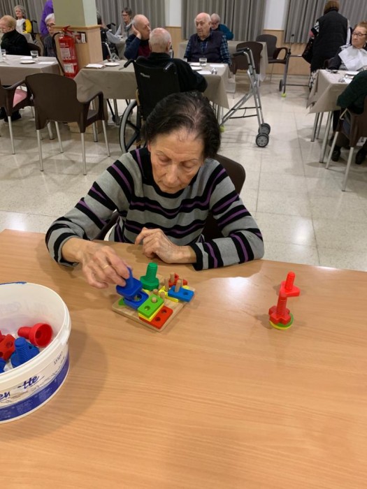Una de les nostres residents entretenint-se amb aquests exercicis. La psicomotricitat fina és aquella on treballem diferentes tasques i activitats que fem amb les nostres mans. Gràcies a ella podem desenvolupar diferentes habilitats de prescició i de coordinació de diferents parts del nostre cos.