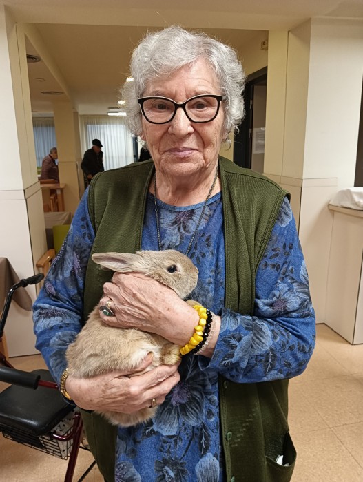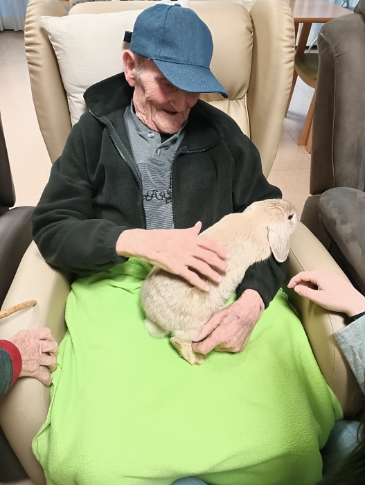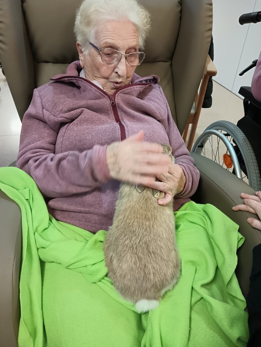 Visita de dos conills per part de la família Anguera per animar els residents.