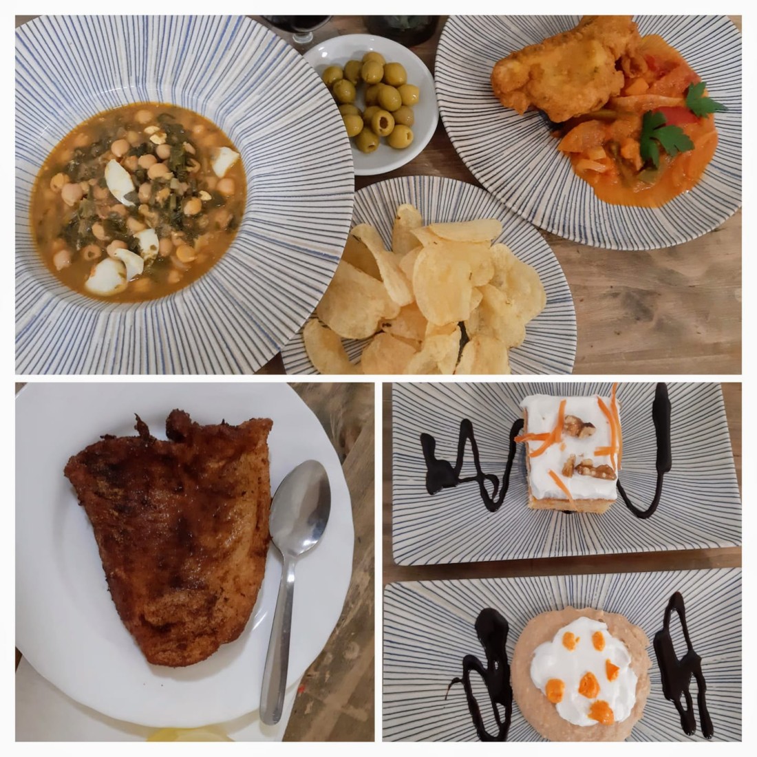 ????️ Dinar: Aperitiu, cigrons amb espinacs i ou dur, bacallà a la tempura amb verdures i, de postre, pastís de pastanaga.