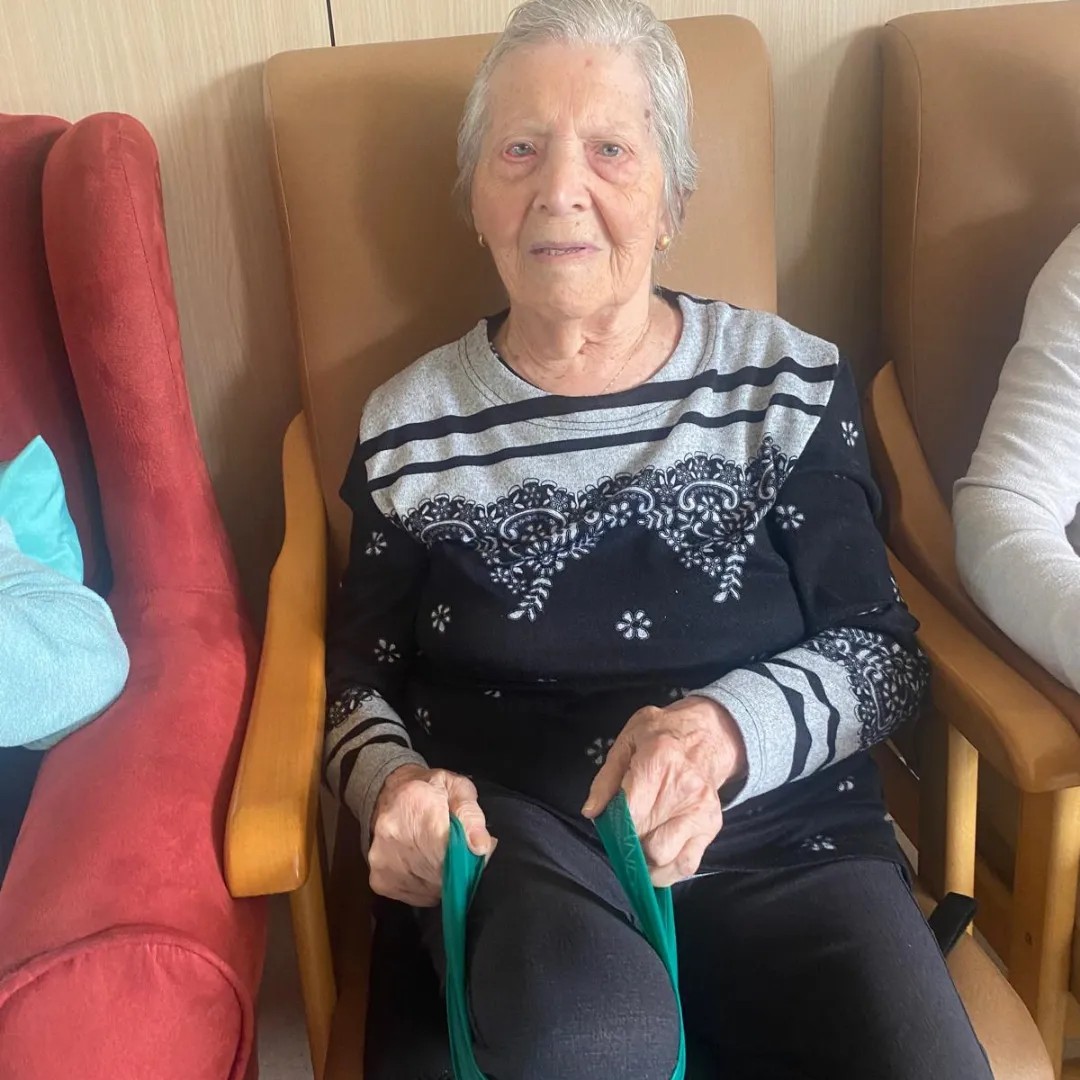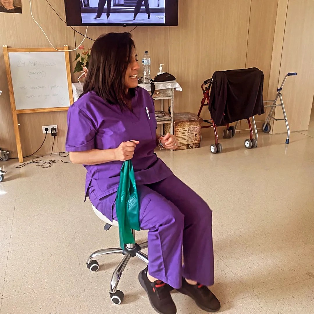 Mobilització de les extremitats inferiors amb la Marbel, la terapeuta ocupacional del centre.
