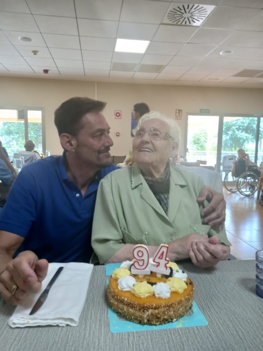 Carmen ha bufat les espelmes del pastís de l aniversari en companyia del seu fill, tot el menjador hem cantat "Cumpleaños feliz "