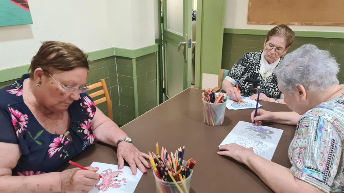 En el Centre de dia, fan una partida de Bingo i alguns usuaris estan molt enfeinats pintant peixos per acabar el mural de l'estiu que han anat treballant.