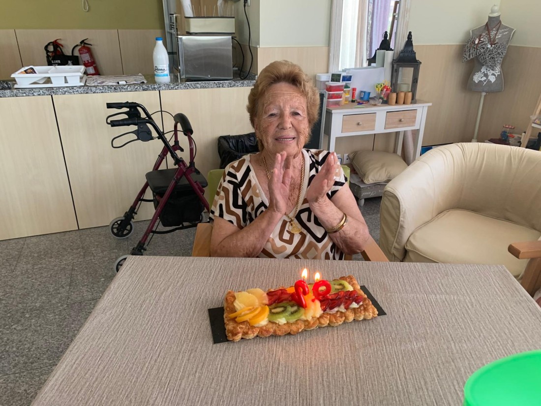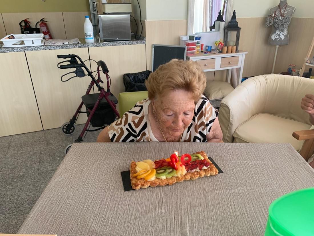 La Isable, que aquest mes és la l'avia protanista del Centre de Dia de Mont-roig ha fet ni més ni menys que 92 anys!! i la seva familia ho ha volgut celebrar amb nosaltres i ens han portat aquestes bandes de fruita que han gaudit els nuestros residentes!!