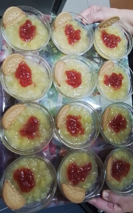 Avuí la nostre cuinera Sílvia ens ha preparat un postre boníssim imespecial. Compota adornada amb confitura de maduixes.
