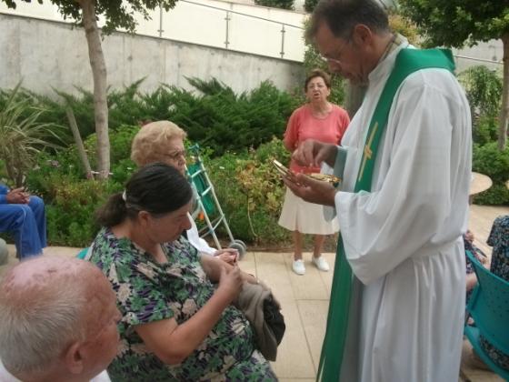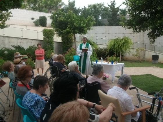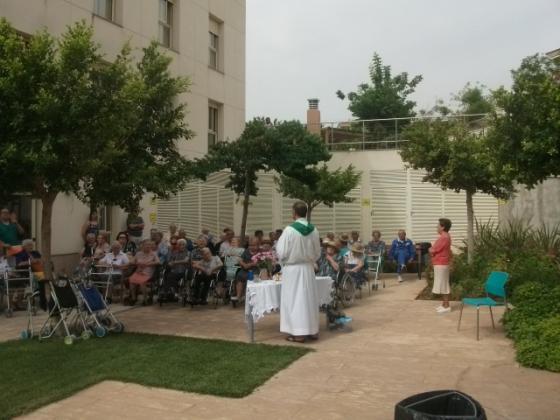 A la Residencià L'Onada Golden Beach van començar a celebrar la Missa al jardí, aprofitant l'ombra i la fresca que fa..., l'espai és molt relaxant : arbres , flors és un entorn perfecta per celebrar la Eucaristia.