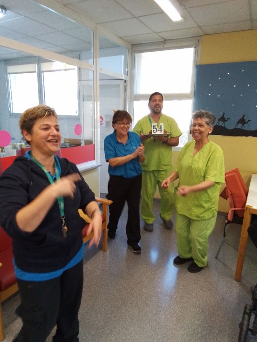 Hoy es el cumpleaños de nuestra compañera Natalia. Muchas felicidades. Nos ha traido un pastel para celebrarlo.