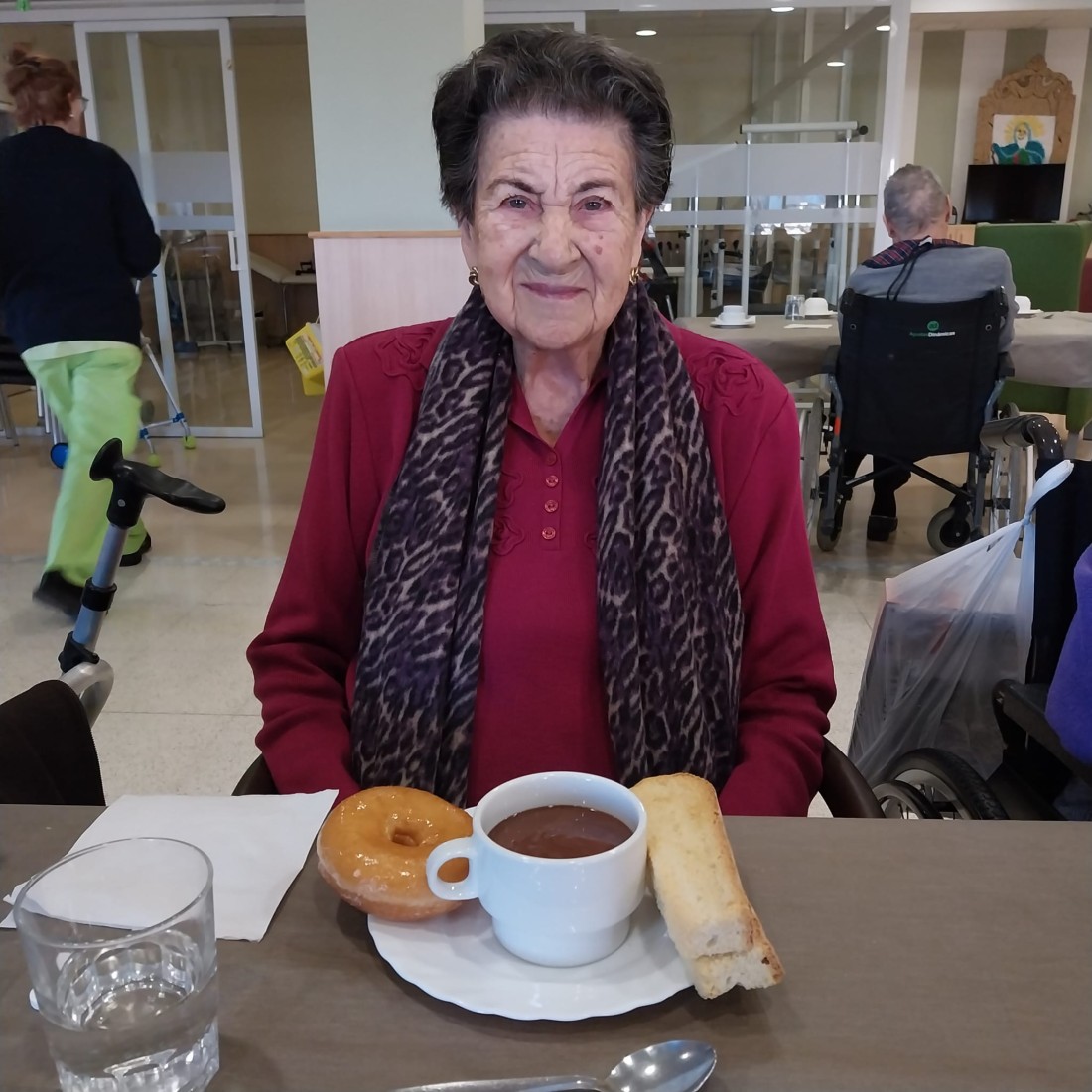 Xocolata a la tassa amb pa torrat i dònut.