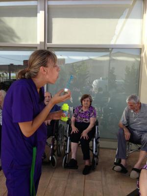 A Deltebre hem fet un taller molt divertit, on els avis havien de bufar per a fer burbujetes, per a molts de ells no era la primera vegada que ho feien, i altres que no sabien com fer-ho, ens han explicat que era una diversió quan eren menuts i els ha agradat tornar a repetir-ho.