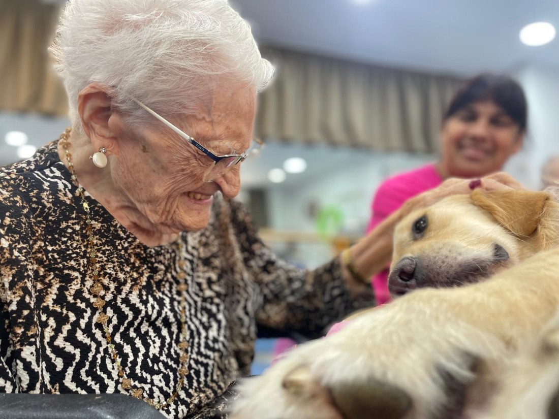 A la nostra residència, cada dimecres gaudim de sessions de teràpia amb gossos, una activitat que ens aporta alegria, calma i molts moments especials.