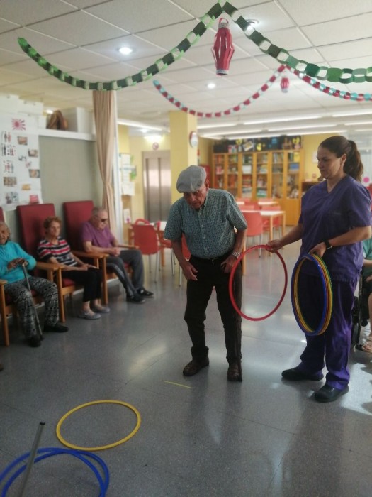 Hoy en la taller físico funcional realizamos la actividad con aros que consiste en acertamos en un sitio determinado. Esta dinámica lúdica nos permite trabajar la coordinación motriz, el equilibrio y la precisión en los movimientos.