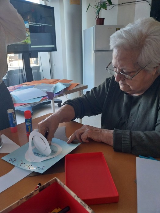 Acabada La Castanyada ja pensem amb Nadal: comencem amb les postals nadalenques. En el taller de manualitats ocupacionals, Laura de l'Institut de l'Ebre, enns ajuda amb la tasca.
