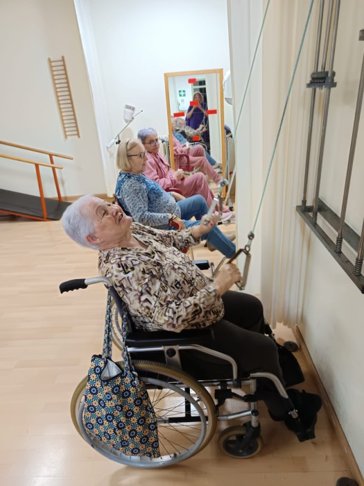 Sessions de rehabilitació al gimnàs, amb paral·leles, escales, politges i pedals per treballar la mobilitat. Un espai on recuperar-se, posar-se en forma i gaudir de bona companyia. Moments de relax i converses enriquidores. Mou-te!